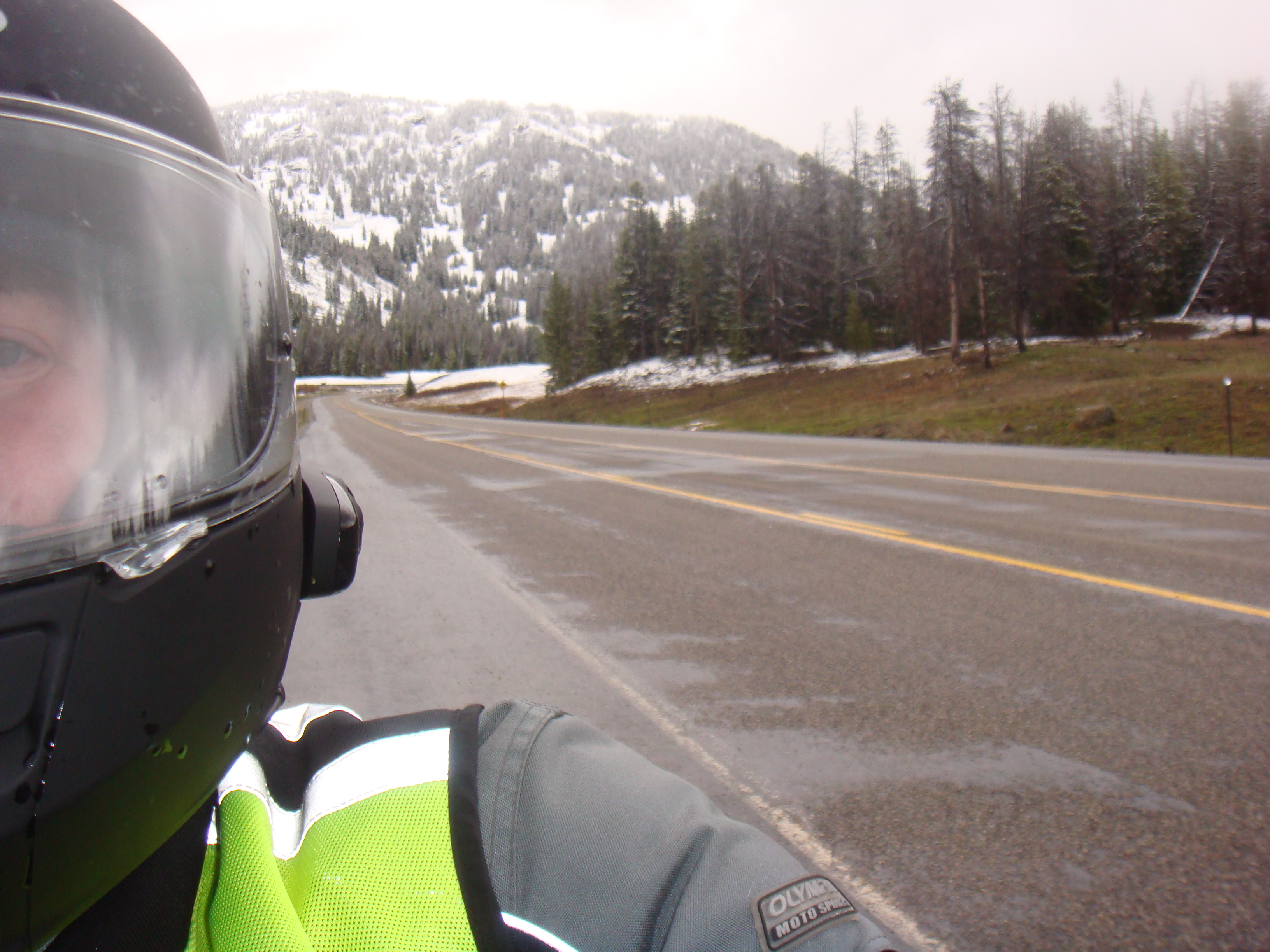 32 degrees, the road is wet, it’s snowing…the only good news is that we had reached the summit. Here’s some pictures of what that looked like from the bike.