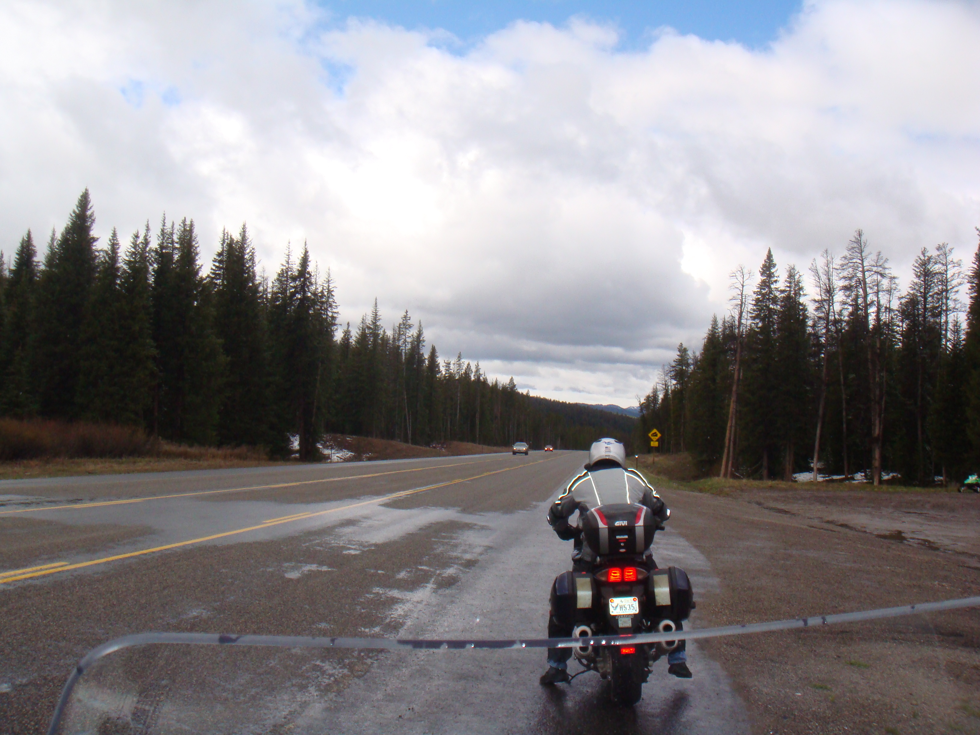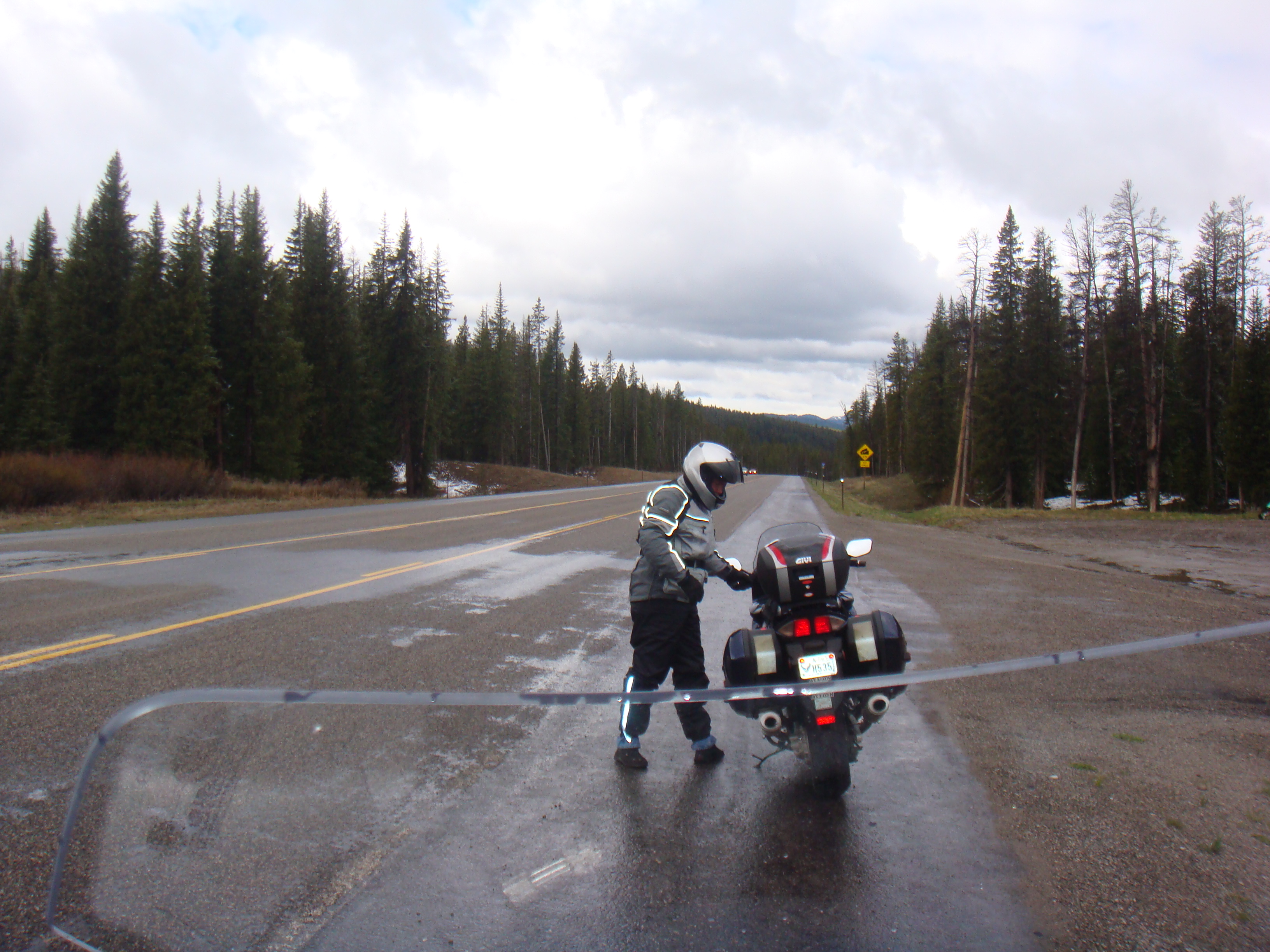 As you can tell, the roads are wet and it is very chilly, but we continued on. When we pulled over again to adjust some rain equipment, disaster struck. My buddy is behind me and we are chatting about where to pull over. We decide to pull over along the side of the road as that’s about all there is in this part of Wyoming. We still have the intercoms on and as I pull to a stop and put the kickstand down, I hear him yell “Oww…dammit” and hear a crash. I turn around in time to see him and the bike laying about halfway into the lane. Not good. I make sure my bike is secure and then go help.